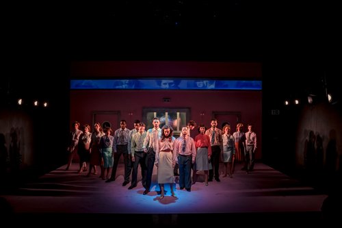 “Molly O’Cathain’s aggressively orange set and costumes conjure a 1970s Euro-variety television show, eventually giving way to the full spectrum of colors as we approach the near-future. The transition from artificial brightness to genuine darkness is one of the production’s most striking visual gestures. John Gunning’s lighting, in partnership with O’Cathain’s playful aesthetic, transforms the space into a theatre of entropy — a world literally burning through its palette.”